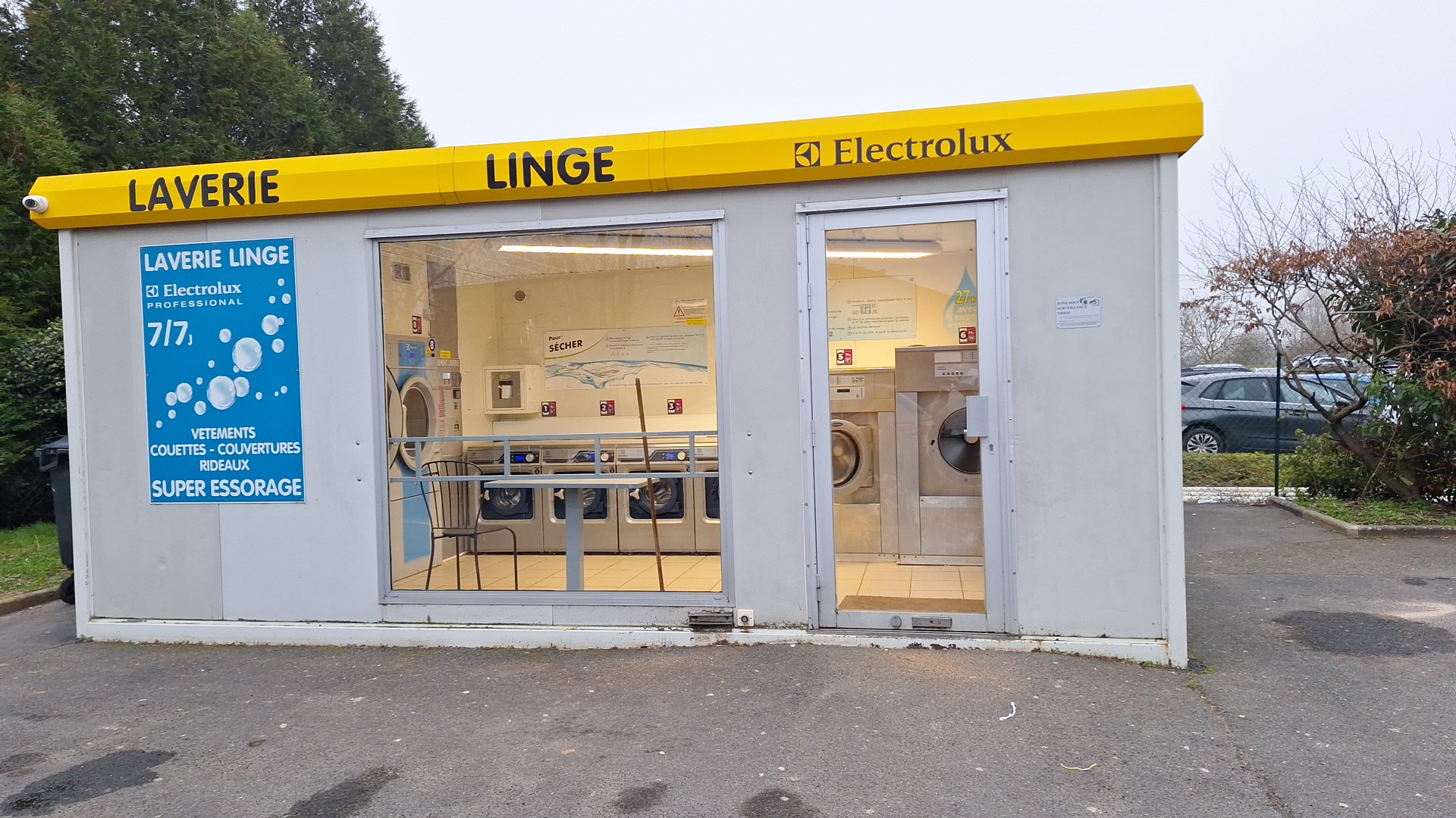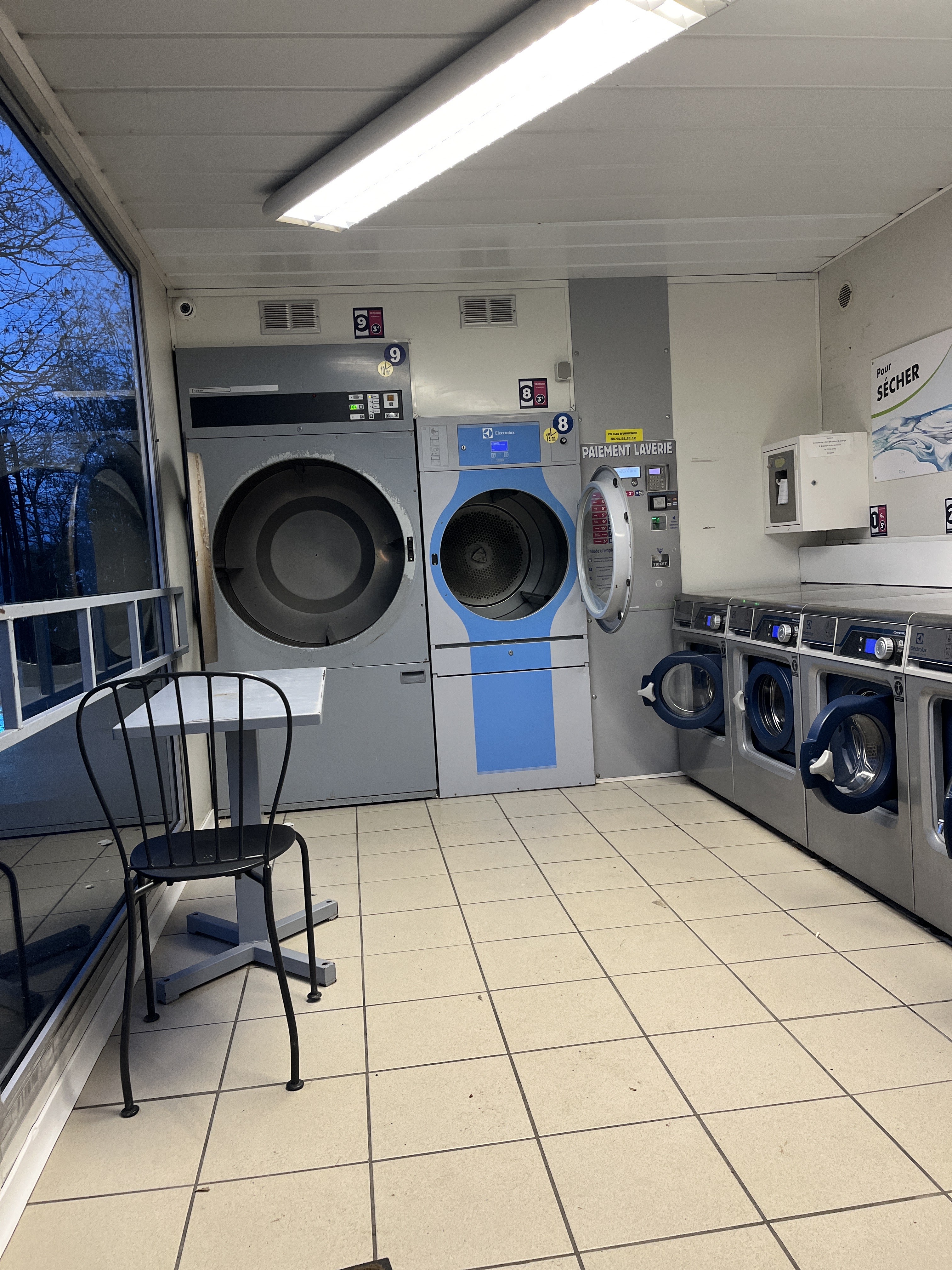 Le ménage a du être fait depuis les derniers avis ! C’est propre ! 4 petites machines a disposition, 1 de 14kg et 1 de 27kg (15€) + 2 séchoirs. Le distributeur de lessive est HS, pensez à en amener. Pour laver les couettes c’est nickel !