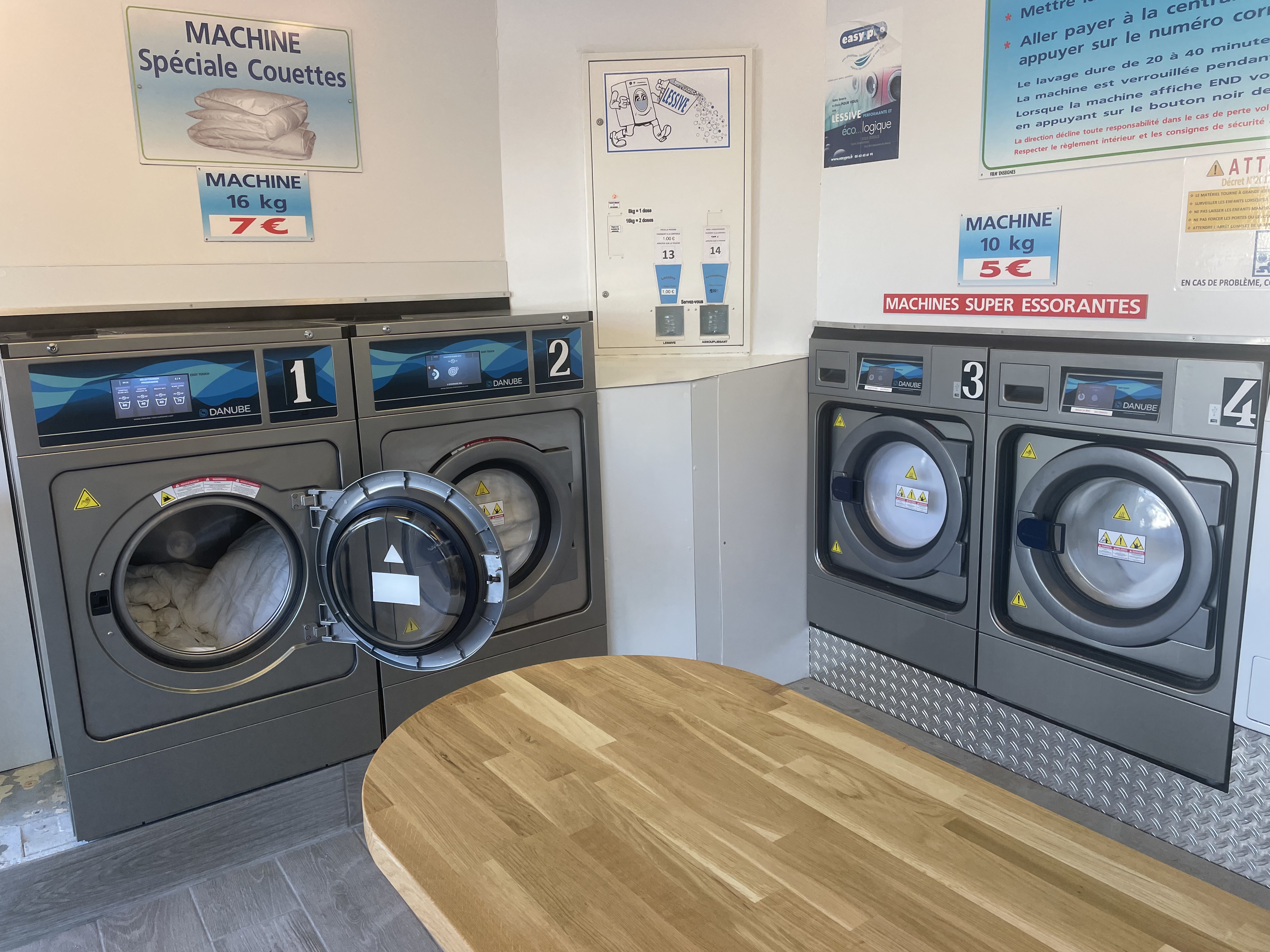 Machines à laver avec grosses capacités pouvant mettre plusieurs couettes ou couvertures, elles ressortent nickels, séchage possible et laverie propre.