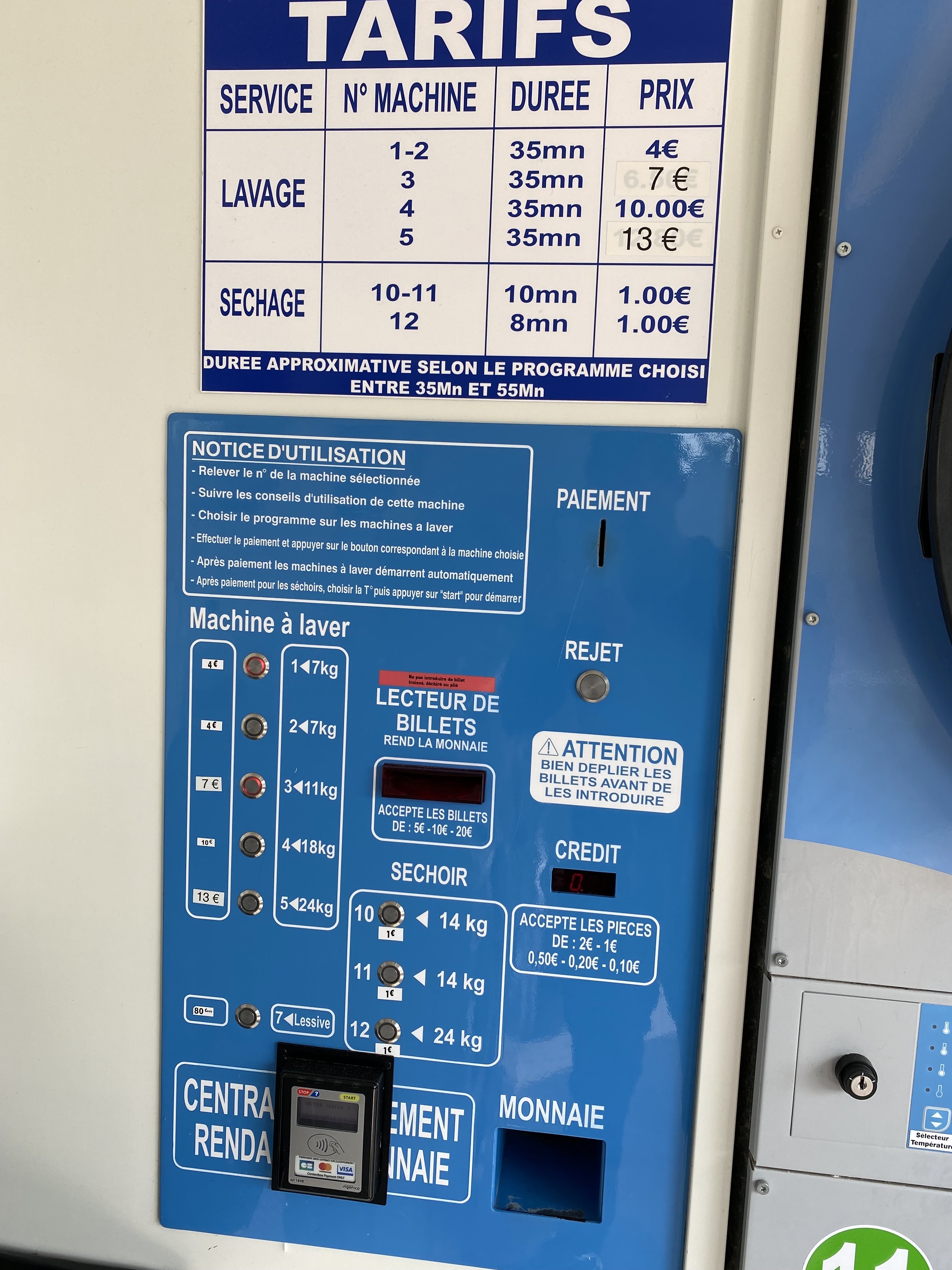 Posté le 12/06/2019 à 07:51" Il y a deux machines à laver de 7 kg (coût 4 €), une de 11 kg (coût 7 €), une de 18 kg (coût 10 €) et une de 24 kg (coût 13 €) ; il existe également deux séchoirs de 14 kg (coût 1 € toutes les 10 minutes) et un séchoir de 24 kg (coût 1 € toutes les 8 minutes). "