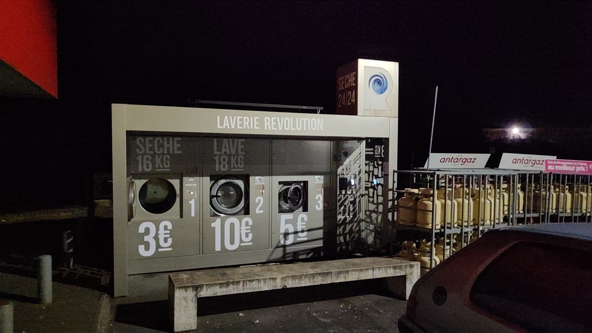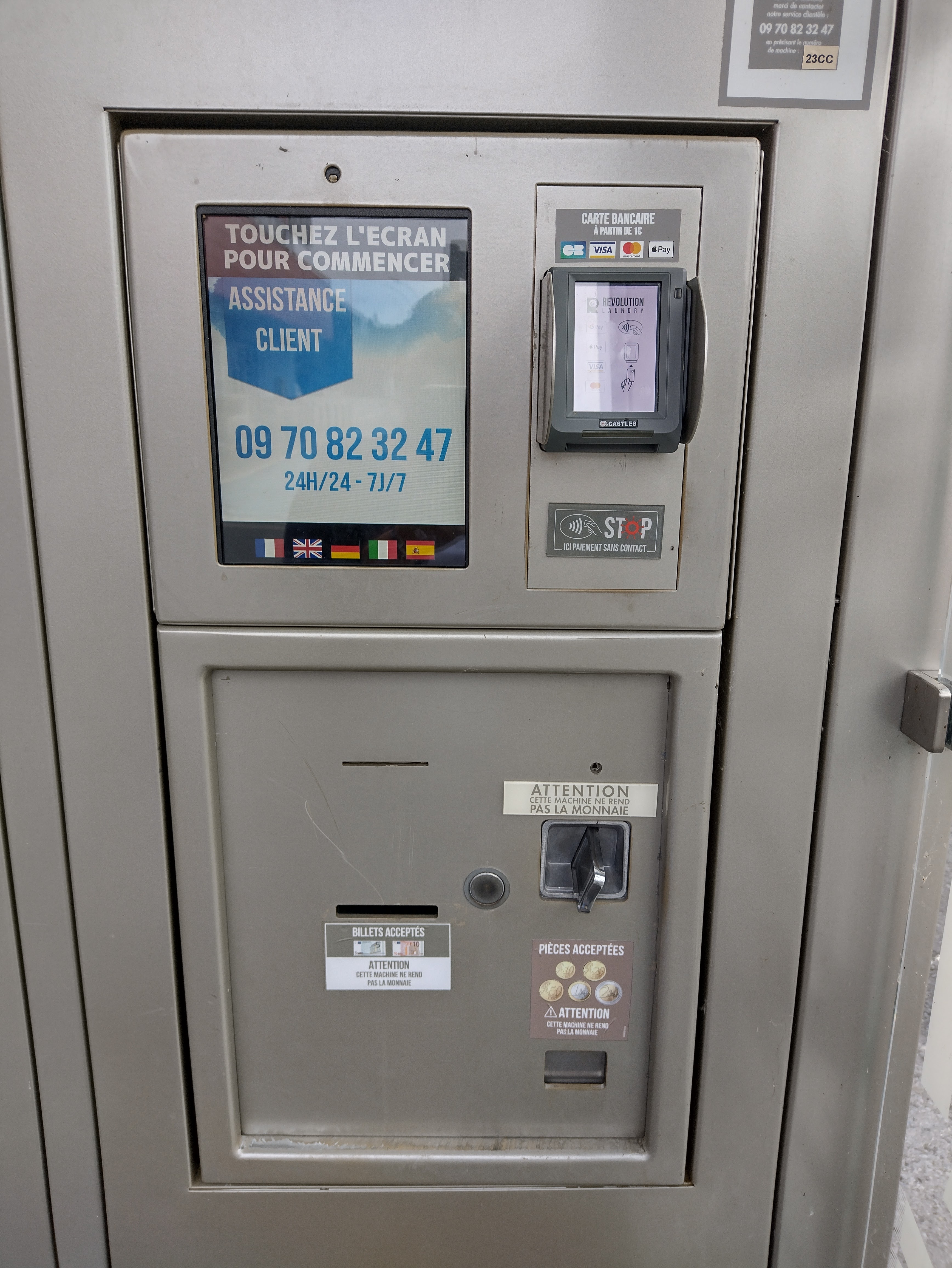 Cette laverie est un endroit idéal pour les camping-caristes et les locaux qui peuvent en profiter ainsi que sur le parking commercial en bord d'aire pour camping-cars. Vous pouvez payer par carte ainsi qu'en espèces. Maintenant les points négatifs... Dommage que ce soit sale et pas très bien entretenu avec des garnitures de porte qui pendaient. Il y a des espaces entre les machines et le boîtier avec des déchets déposés et des petits vêtements tombés. Vous devez nettoyer ce que vous allez toucher et vérifier l'intérieur des machines, car cela peut également nécessiter un nettoyage. Le gobelet est horrible et ne chauffe pas du tout même à réglage élevé et la minuterie ne fonctionne pas. Il a fallu 3 cycles pour un total de 9 euros pour sécher nos serviettes. La plupart de ces laveries sont belles et mieux entretenues que celle-ci
