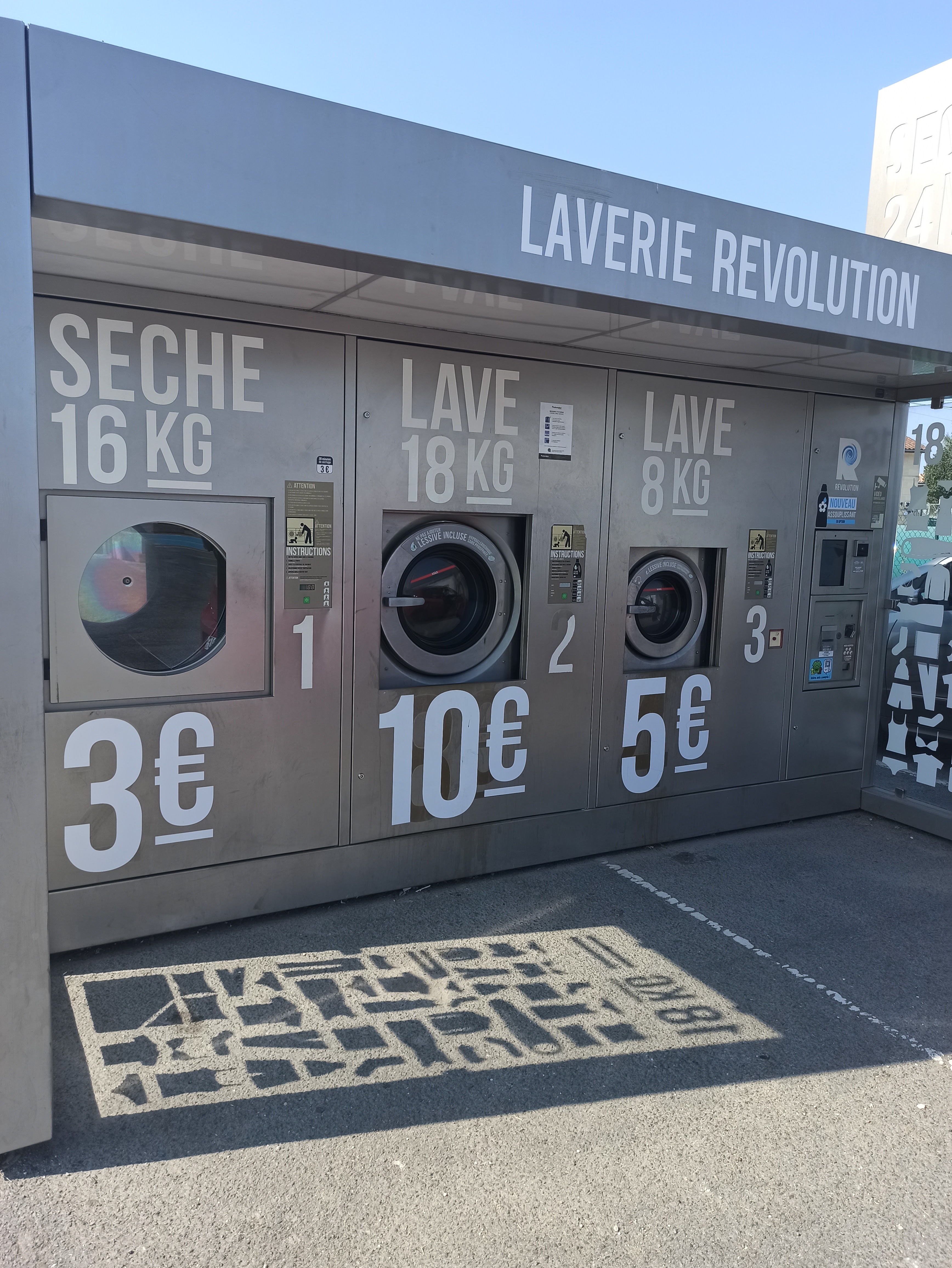 Machine à laver de 18kilos, 10€ ou 8kilos à 5€. La lessive est inclus dedans. Sèche linge 16kilos , 3€ les 20 minutes de sechages. Durée 30 minutes.