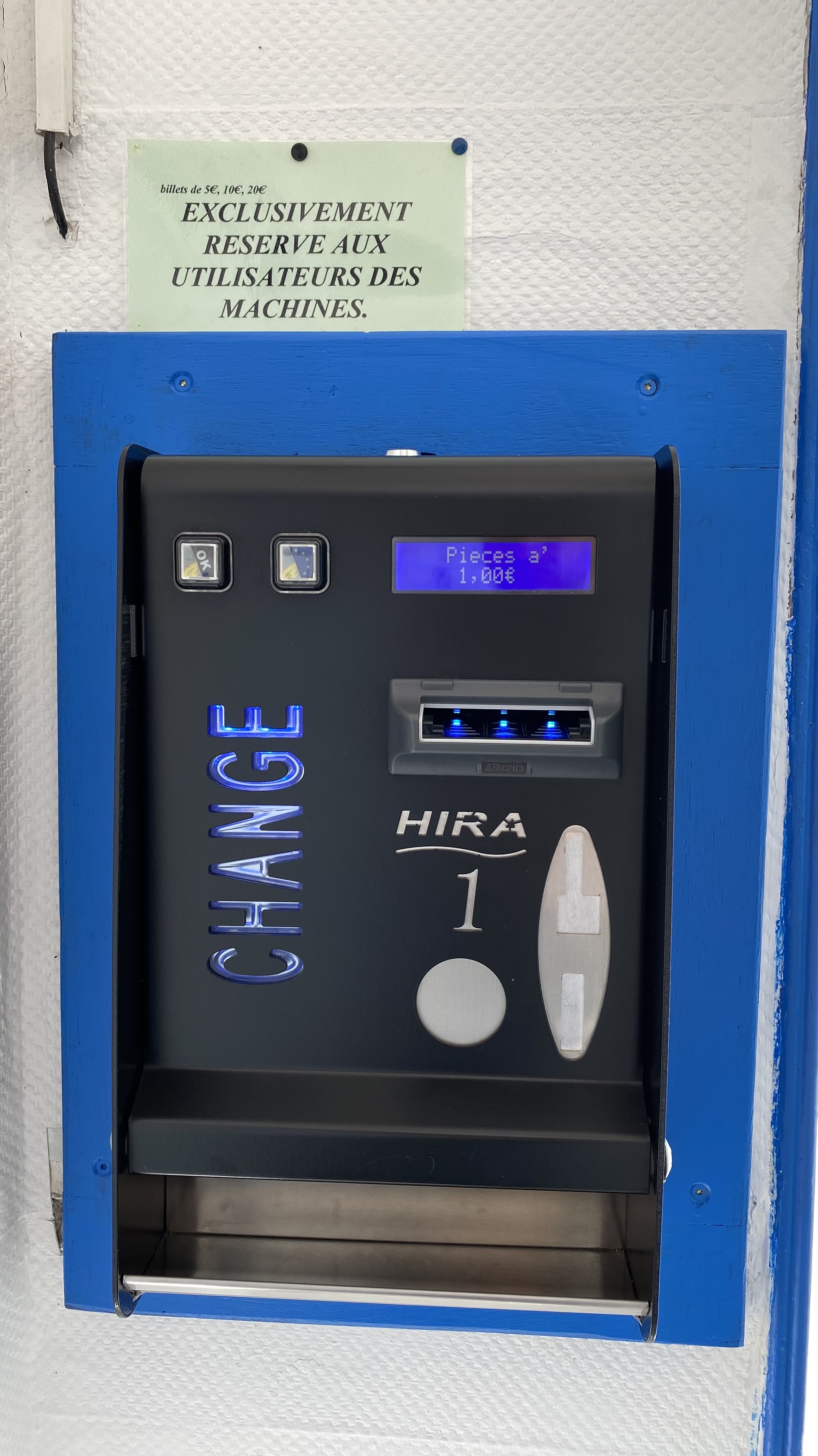 J'ai eu une question concernant l'utilisation des équipements, j'ai appelé au numéro indiqué, le propriétaire m'a répondu et est resté en ligne pour s'assurer que j'avais bien compris pour faire la manipulation. Pas besoin d'aller faire de la monnaie chez leur voisin. Une machine accepte jusqu'aux billets de 20 Euros et rend la monnaie. Ps: la dose de lessive est à 0,40 cts, moins cher que dans d'autres lavo !